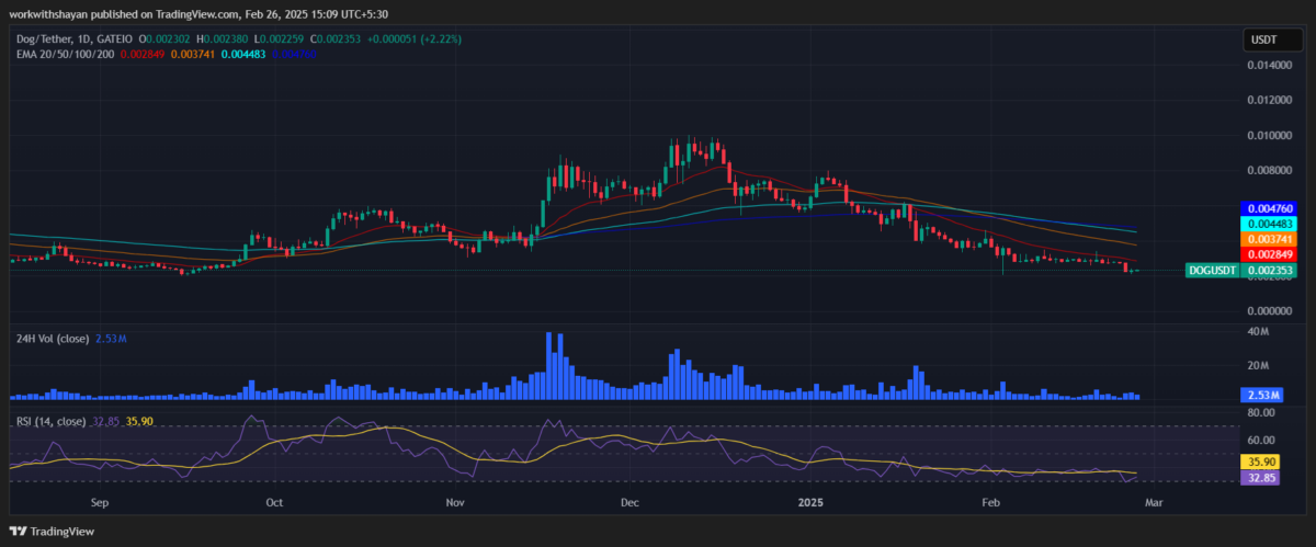 Analyzing the daily price chart of DOG, DOG’s price is struggling to validate a bullish trend as sellers strongly defended a surge above resistance levels. Currently, the price is consolidating around $0.00233. The 24-hour volume declined to $2.5 million, showing less interest in trading activity today. DOG is trading at $0.00235, declining by over 0.8% in the last 24 hours.