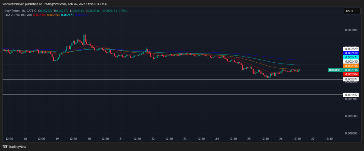 DOG price has been under bearish pressure as it loses momentum around immediate resistance lines. This has pushed the price toward $0.0023, with bears attempting to drive the price further down.