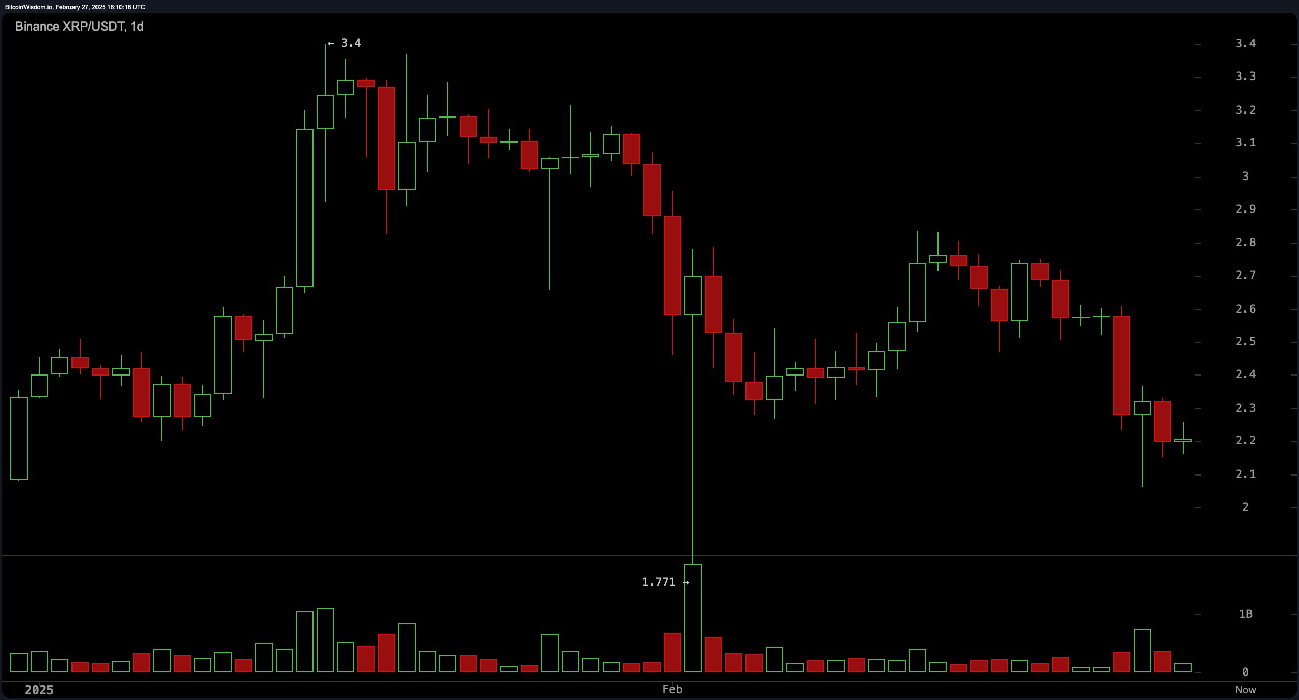On the daily chart, XRP continues to exhibit a pattern of lower highs and lower lows, reinforcing a long-term bearish structure. Resistance at $3.4 remains a distant target, while support at $2.2 has become a crucial level for potential buyers. A previous volume spike around $1.77 signals a strong buy zone, but current momentum remains weak. A recovery scenario would require XRP to establish a higher low above $2.2 and break through resistance levels around $2.6–$2.8. If bearish pressure persists, a drop below $2.1 could expose lower price levels.