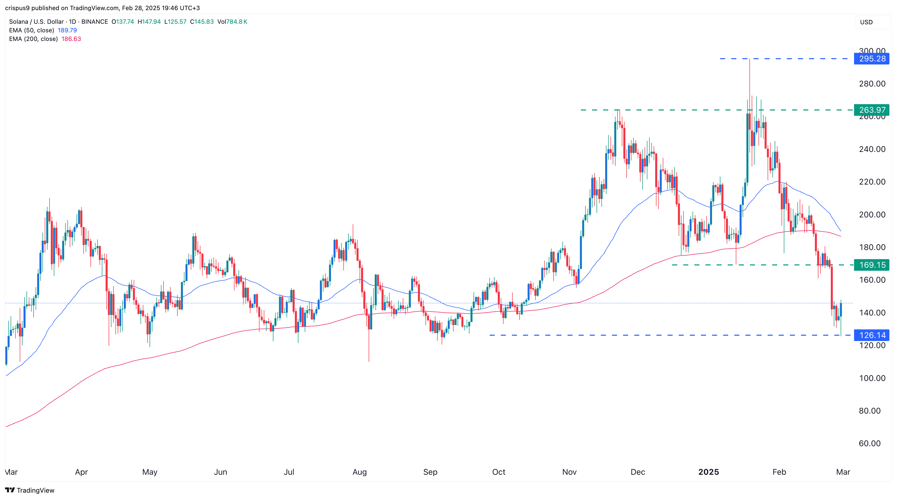 Solana peaked at $295 earlier this year before plunging to $126.15, its lowest level since September 6. It dropped below the crucial $170 support level, which marked the lowest swing on January 13, as well as the double-top pattern neckline at $265—a pattern often considered a bearish signal.