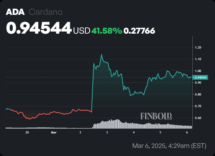 Cardano (ADA) is gaining momentum, trading at $0.945 with a weekly gain of over 41% following U.S. President Donald Trump’s announcement of the U.S. Strategic Crypto Reserve. The move, which includes ADA as one of its assets, has sparked expectations of greater institutional adoption and long-term price stability.