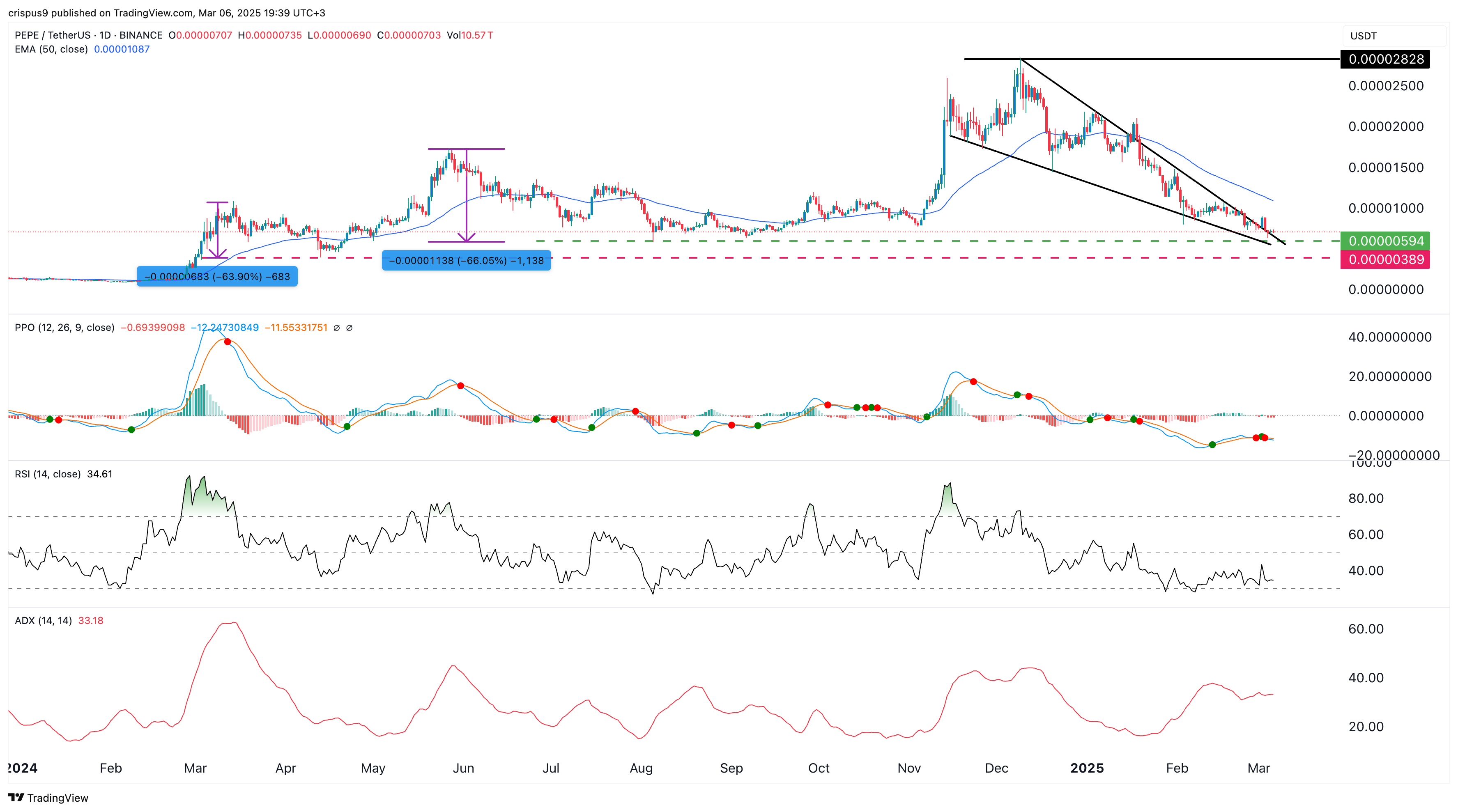 Pepe price remains in a deep bear market after plunging more than 75% from its all-time high of $0.000028.