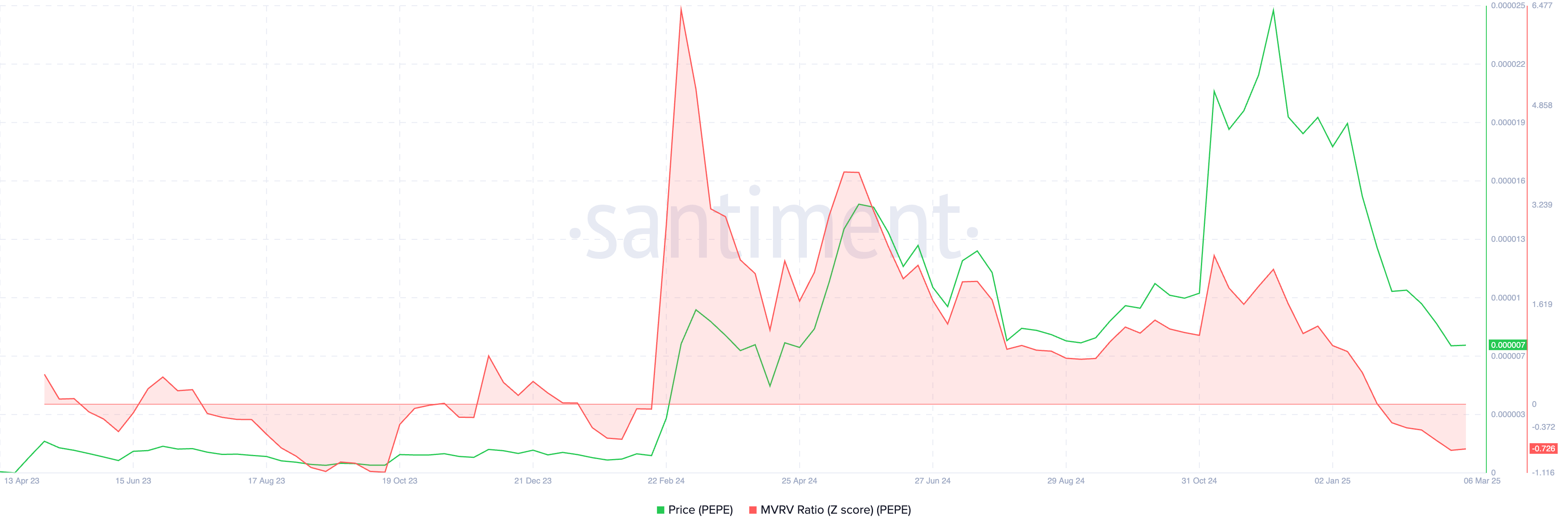 The Z-score of the Market Value to Realized Value (MVRV) ratio has also fallen into the opportunity zone. This indicator, which assesses whether a coin is overvalued or undervalued, has dropped to -0.726, its lowest level since October 2023. This suggests that $PEPE has become a bargain, signaling a potential rebound.