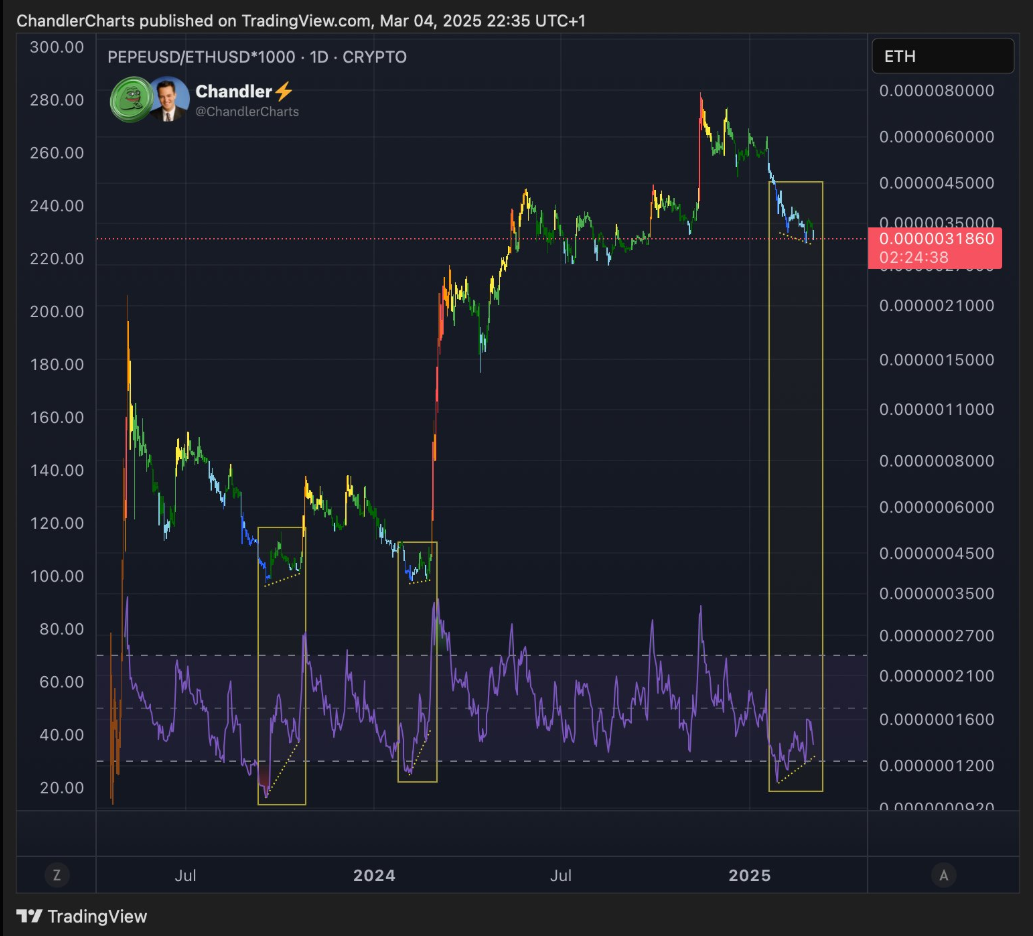 Meanwhile, the PEPE/ETH trading pair shows an RSI divergence pattern, which historically indicated major market reversals.