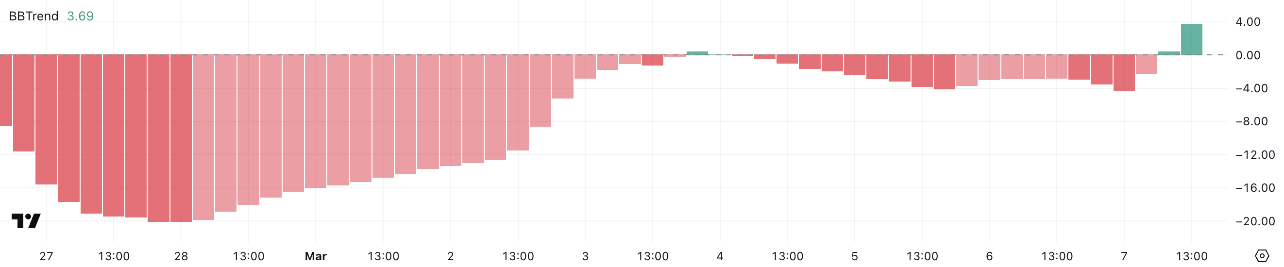 $LINK’s BBTrend has now turned positive, reaching 3.69 after remaining in negative territory since March 4. A significantly negative reading of -20 was recorded on February 28.