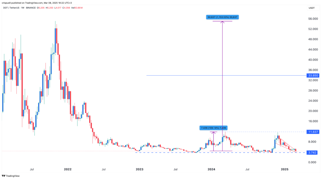 This chart shows that the Polkadot price crash has found a strong support at $3.742. It has attempted and failed to drop below that level at least four times since 2024. All attempts to move below that level faced substantial resistance, meaning that the coin has formed a quadruple bottom whose neckline is at $11.