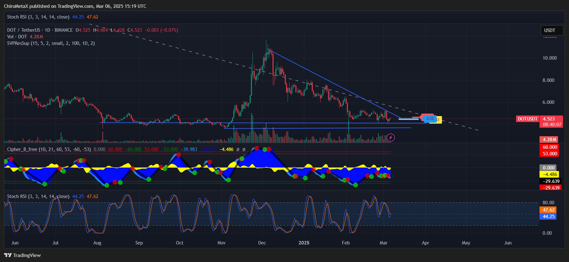 The trading price of Polkadot (DOT) maintains $4.50 support as traders watch the $4.25 bottom level.