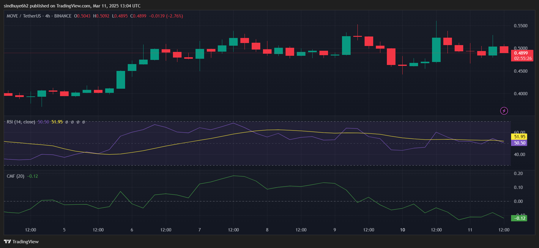 MOVE’s price action depends on breaking resistance or holding support. A bullish breakout above $0.5092 could trigger further gains. However, declining CMF suggests caution. Traders should watch for increased volume and a positive RSI shift before confirming upward momentum.