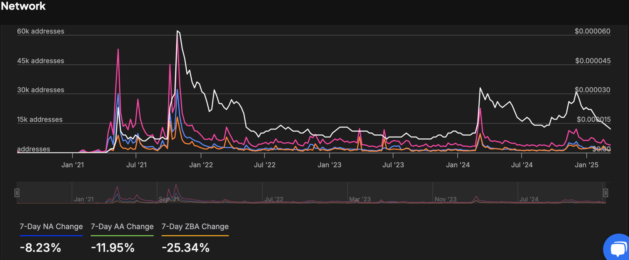 The 7-day Zero Balance Addresses (ZBA) Change showed a significant 25.34% drop, indicating more wallets are becoming inactive or being drained. This suggests declining investor interest and weaker overall market participation.