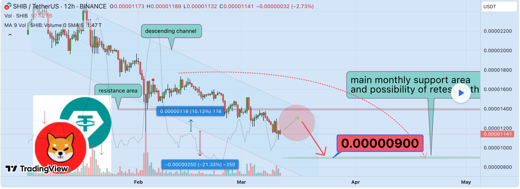 A 12-hour SHIB/USDT chart from TradingView presents a downward trend, reinforced by technical indicators. The chart shows that Shiba Inu is within a descending channel characterized by lower highs and lower lows.