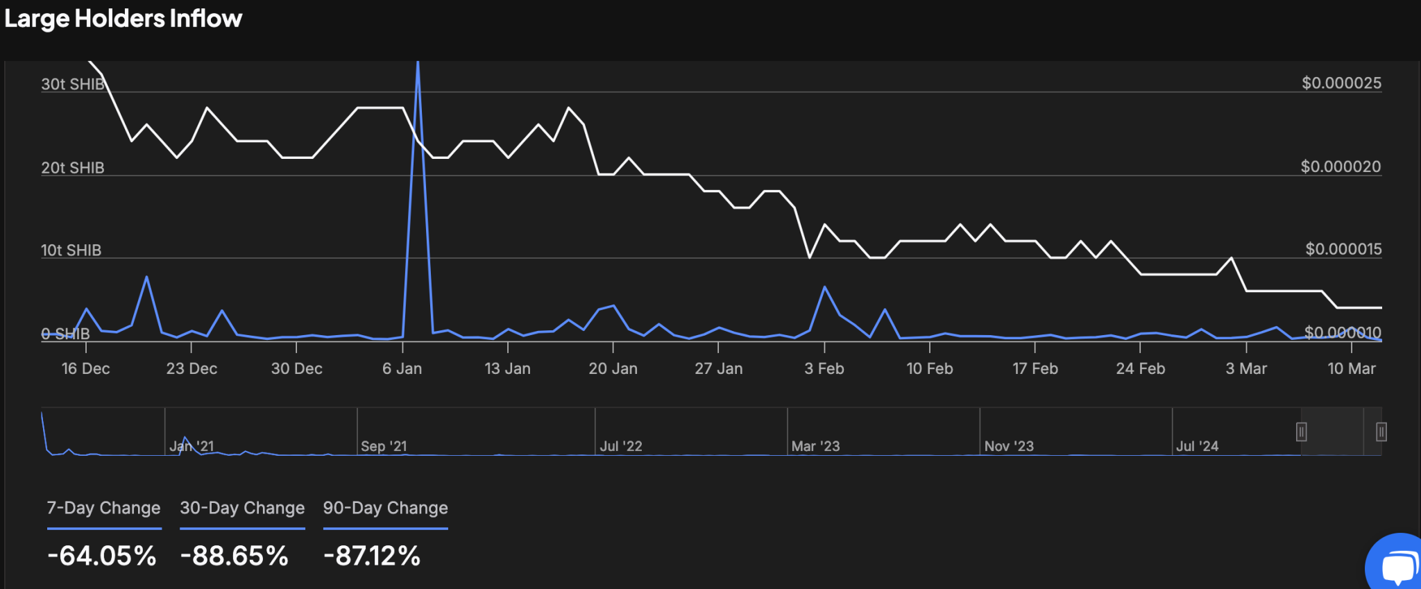 The 90-day inflow decrease of 87.12% further indicates an extended period of large-scale investor exits, contributing to SHIB’s ongoing bearish trend.