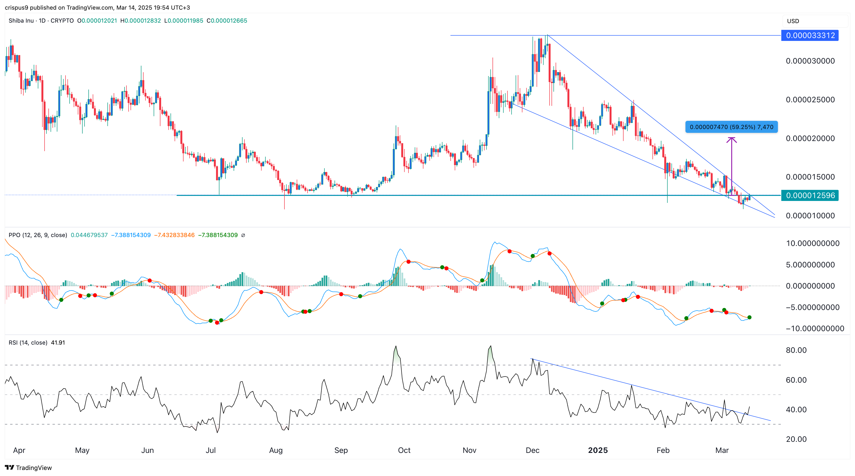 Technical indicators suggest that SHIB may be poised for a strong bullish breakout this year. The daily chart shows that Shiba Inu has been forming a falling wedge pattern, characterized by two descending and converging trendlines.