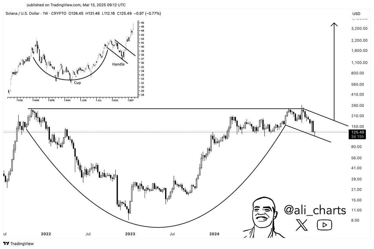 Despite the recent weakness, some analysts see potential for a turnaround. Top analyst Ali Martinez shared insights on X, highlighting that Solana is forming a textbook cup-and-handle pattern, a bullish technical formation that could lead to a breakout. If this pattern plays out, SOL could reclaim higher price levels, reversing some of its recent losses.