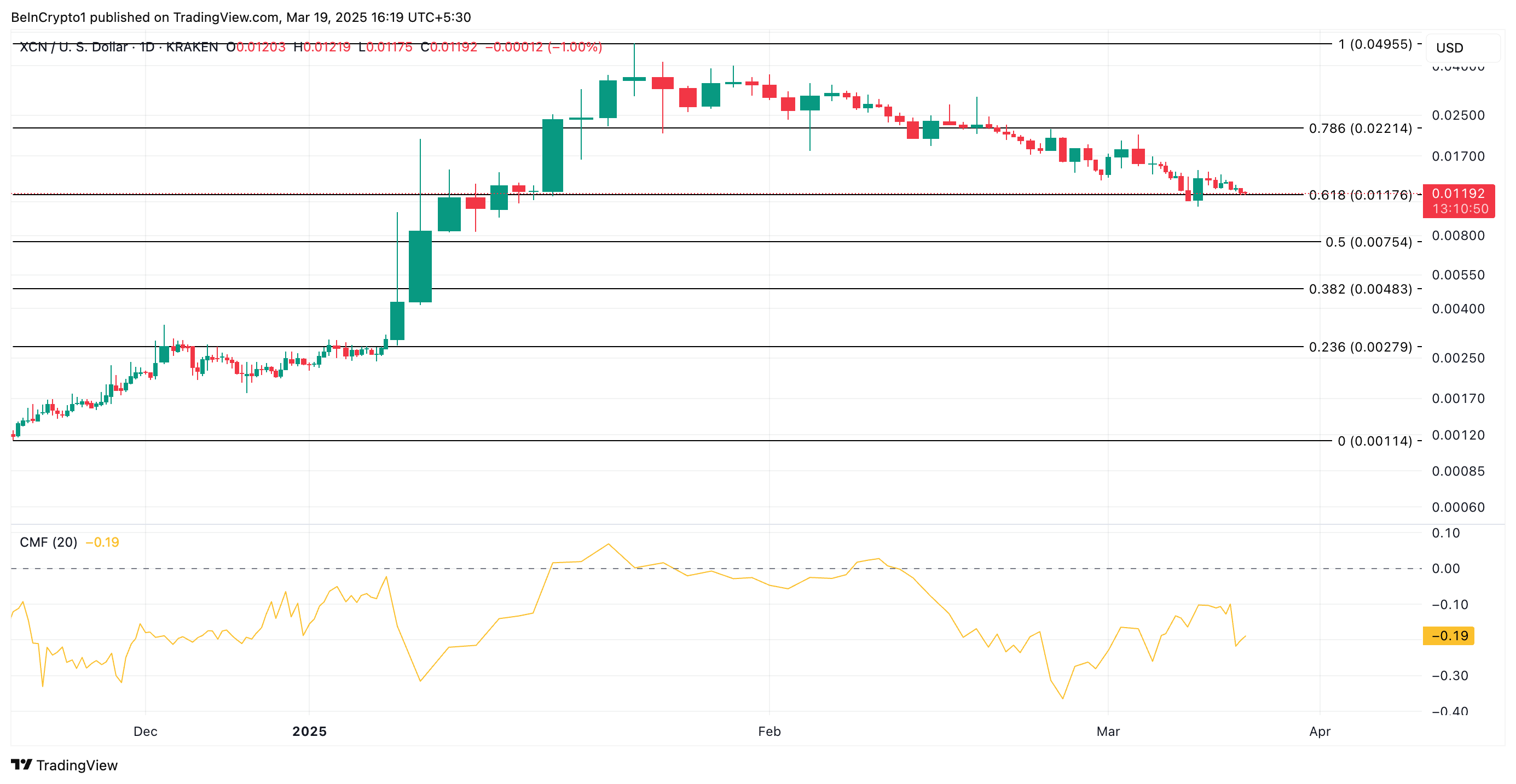 The CMF indicator measures fund flows into and out of an asset. When its value is negative, selling pressure outpaces buying activity. This indicates the likelihood of a further price decline as demand remains weak. In this scenario, XCN’s price could slip to $0.0075.