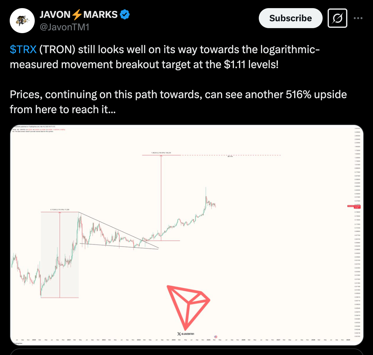 TRON ($TRX) is fighting to stay in a strong uptrend, analysts say its breakout target of $1.11 is still valid. This means a 516% rally for TRX from current levels.