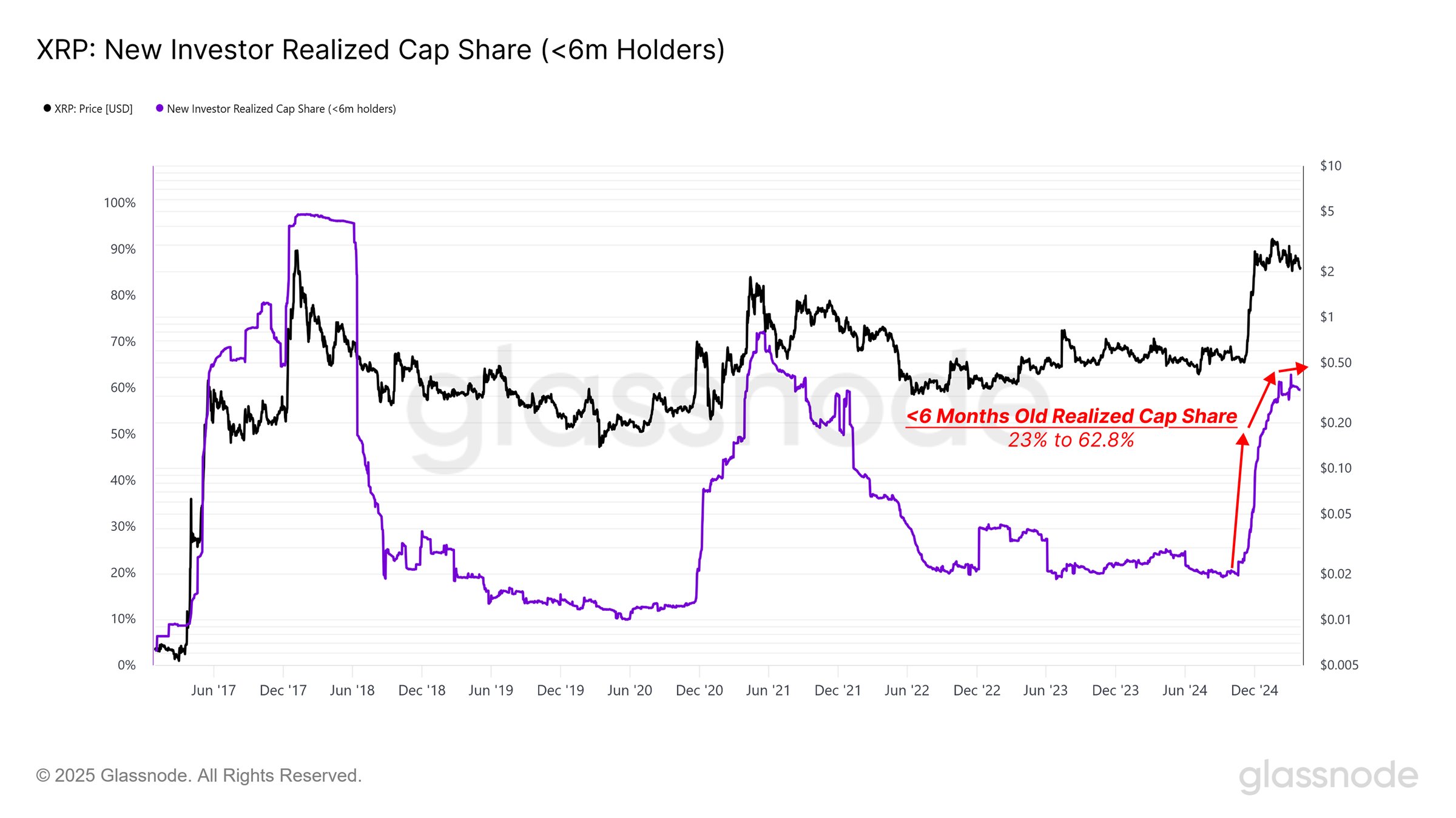 On-chain data shows a large portion of the XRP Realized Cap is in the hands of investors who got in during the last six months. Here’s what this could mean for the asset.