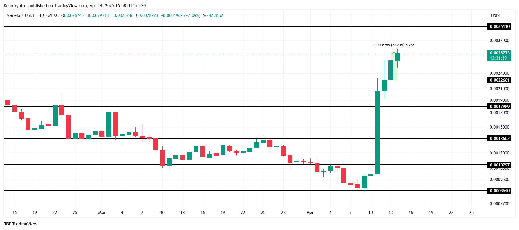 MANEKI price surged by nearly 28% over the last 24 hours, reaching $0.0028. This significant rise marks a continuation of the altcoin’s rally from the previous week.