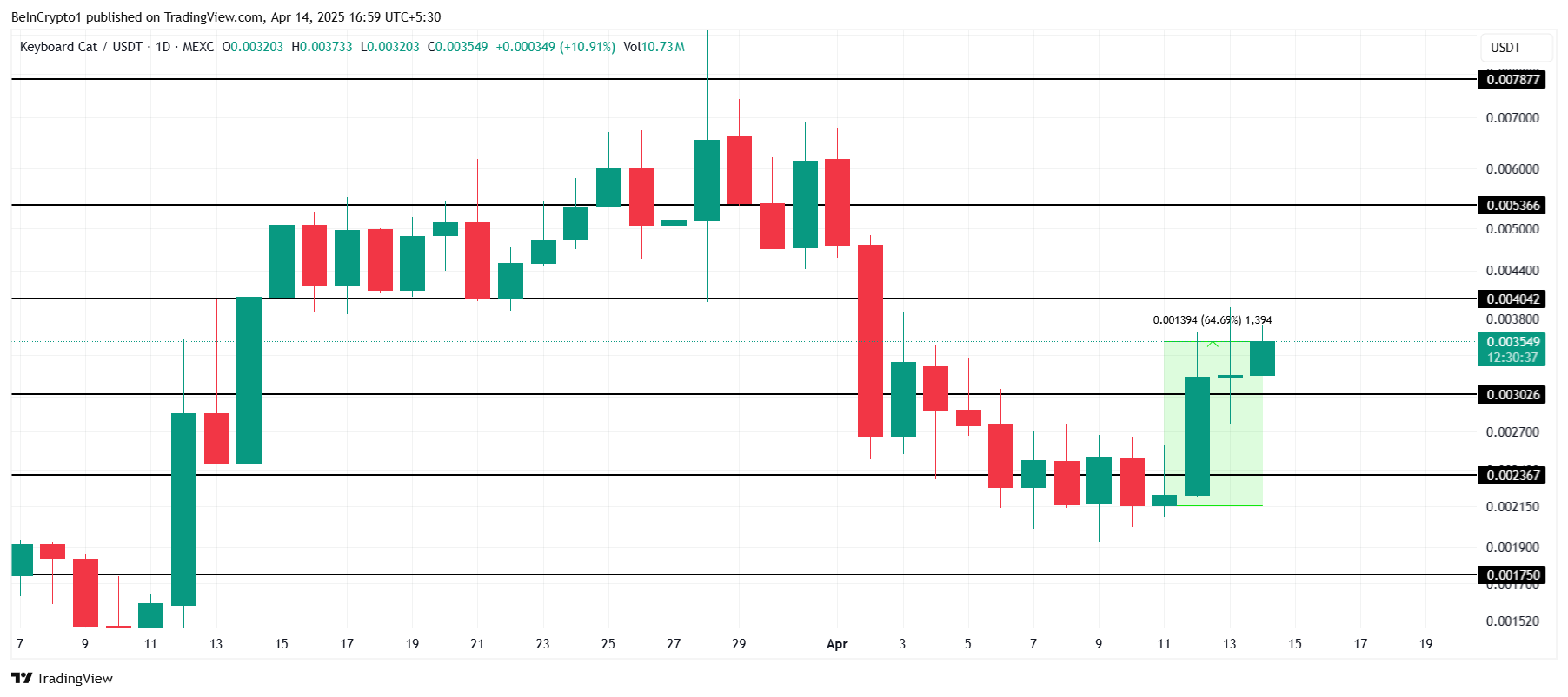The next resistance level for KEYCAT is at $0.0040, and to breach this level, the altcoin will likely need broader market support. If successful, this could propel the meme coin toward $0.0053, solidify the current bullish outlook, and fuel further price action, drawing in more investors.