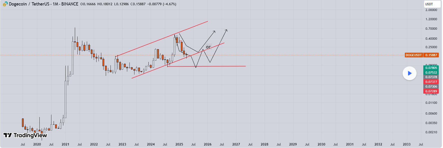 One notable analysis comes from “FuaCompany,” a TradingView account presenting a monthly DOGE chart against USDT. This chart shows DOGE moving within a rising channel, identified by two parallel lines.
