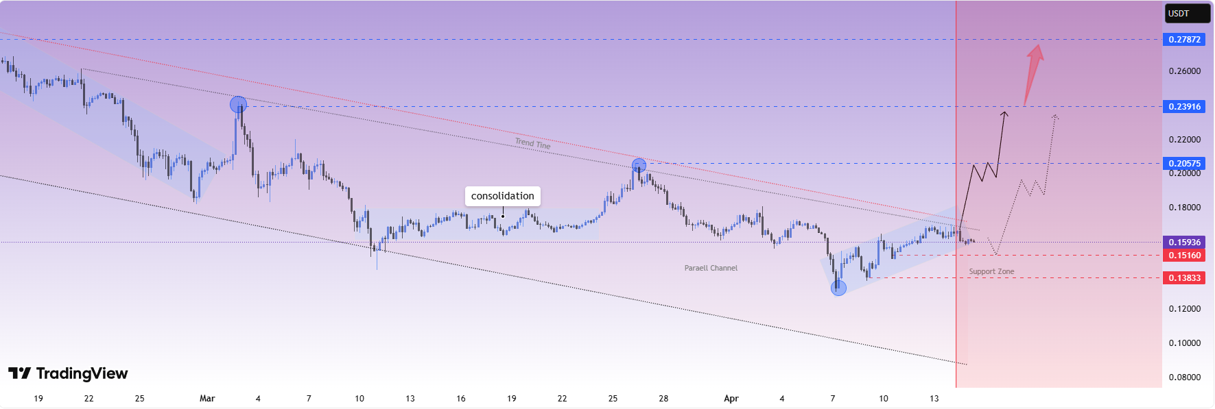 Alternatively, a bearish correction before rebound is also possible. In this scenario, the price could drop sharply to the lower part of the channel, potentially falling below it to around $0.08 before recovering.