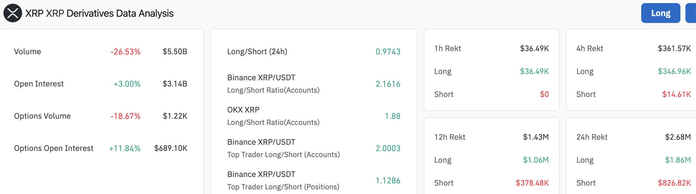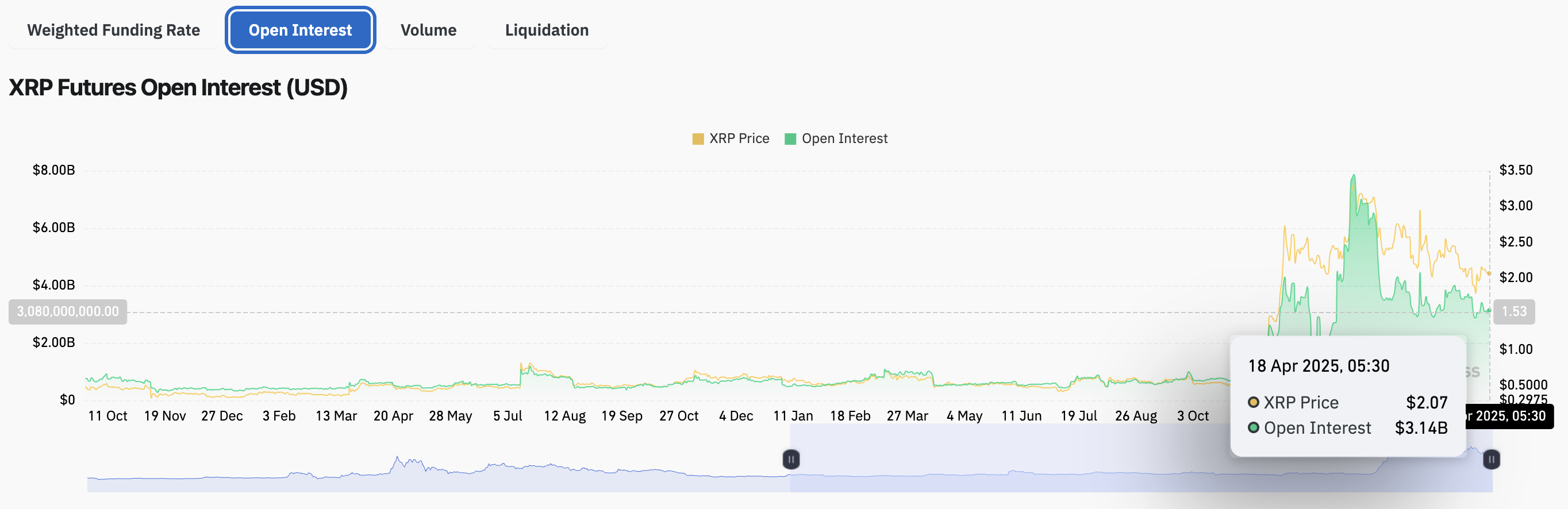 Derivatives data shows the open interest, meaning the value of all open positions in XRP is $3.14 billion. This is above the 2025 average and the altcoin is relevant among derivatives traders.