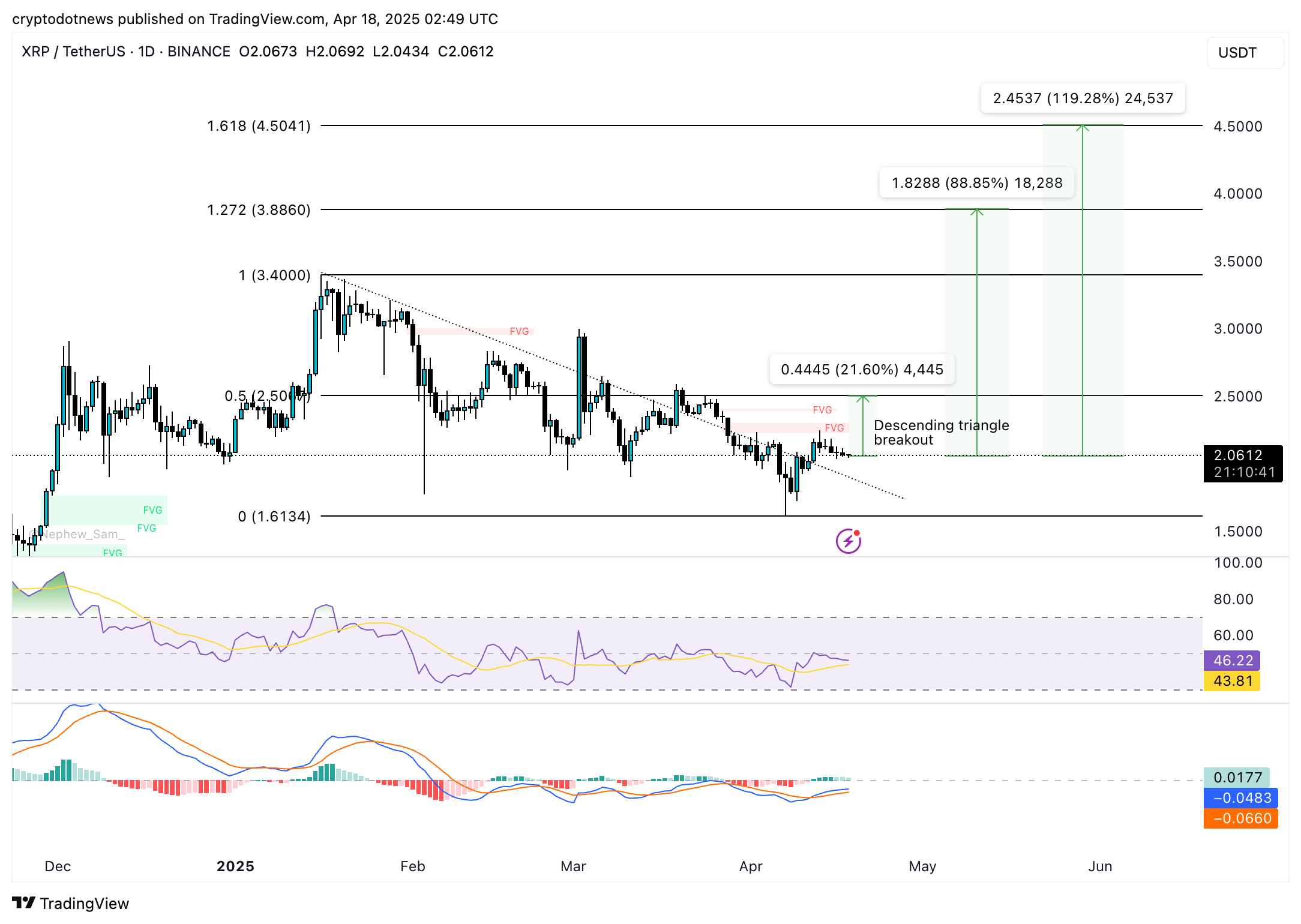 A descending triangle breakout has the potential to push XRP to gain 21% and test resistance at $2.50, an 88.85% rally could push the altcoin to test $3.8860 level, a 127.20% rally in XRP. XRP could post nearly 120% gains and climb to a peak of $4.5041.