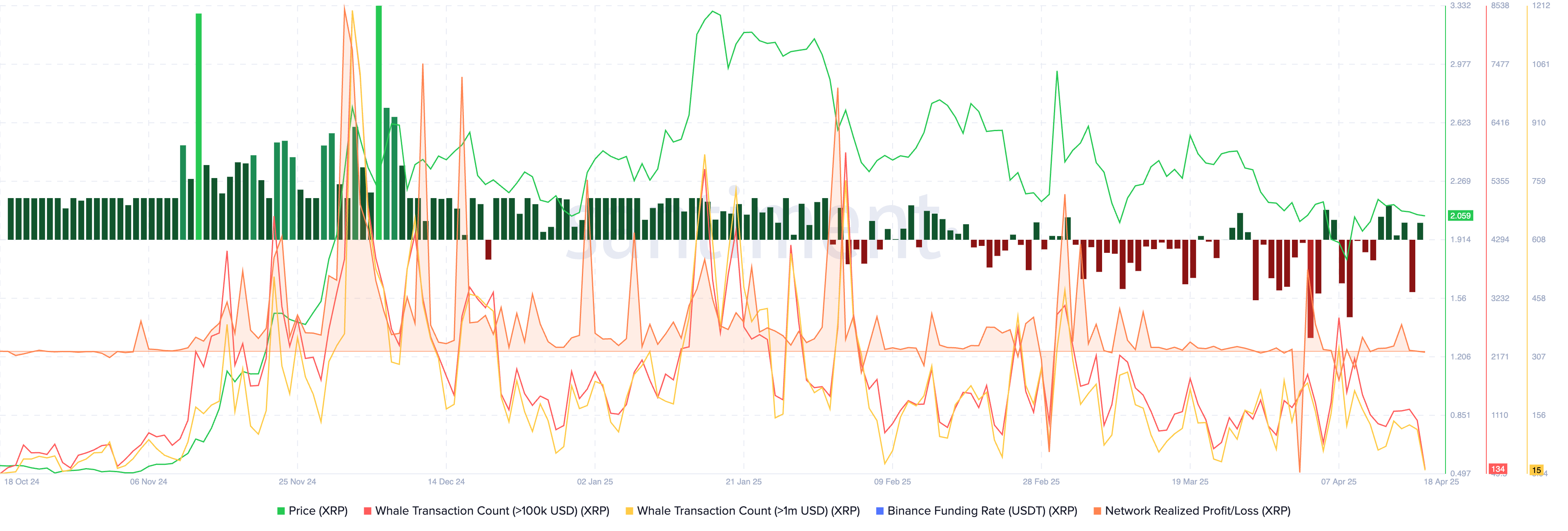 Network realized profit and loss metric that identifies the net profit/loss of all tokens that were moved on a given day reads 4.41 million in losses. XRP traders have shed their holdings at losses, however this appears to be limited to retail participants, as whale transactions valued at $100,000 and higher and $1 million and higher.