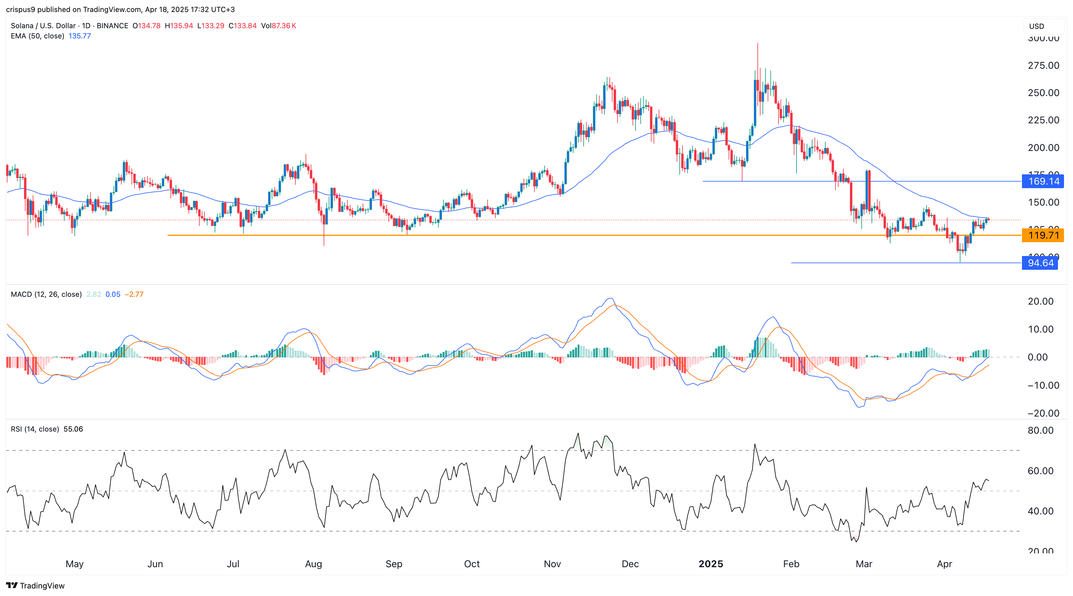 The daily chart indicates that the SOL price bottomed at $94.65 earlier this month and subsequently rebounded to $135. It has moved above the key support at $120, which it failed to break below several times since 2024.