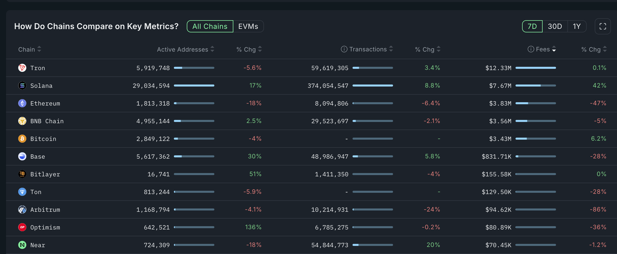 Additional data shows that the number of transactions processed by Solana increased to 374 million. These transactions are higher than those on the other blockchains combined. Solana’s network generated over $7.67 million in fees, up 42% from a week earlier.