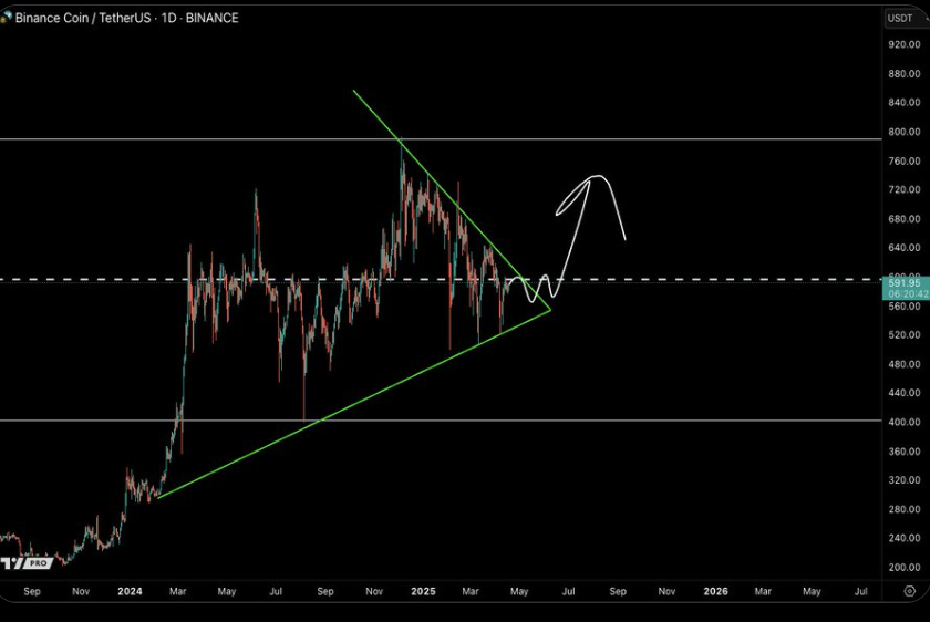 Another analyst, MisterCrypto, has supported this outlook and suggested that BNB is poised for an upward breakout, targeting resistance levels near $630.