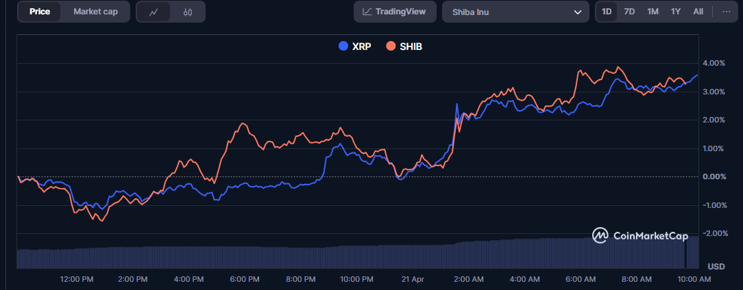 Remarkably, Shiba Inu and XRP have shared a striking price correlation lately. Data shows that although SHIB shows a more bullish momentum, its prices seem headed in the same direction. With both assets currently moving upwards, Kooistra’s XRP short position could face issues.