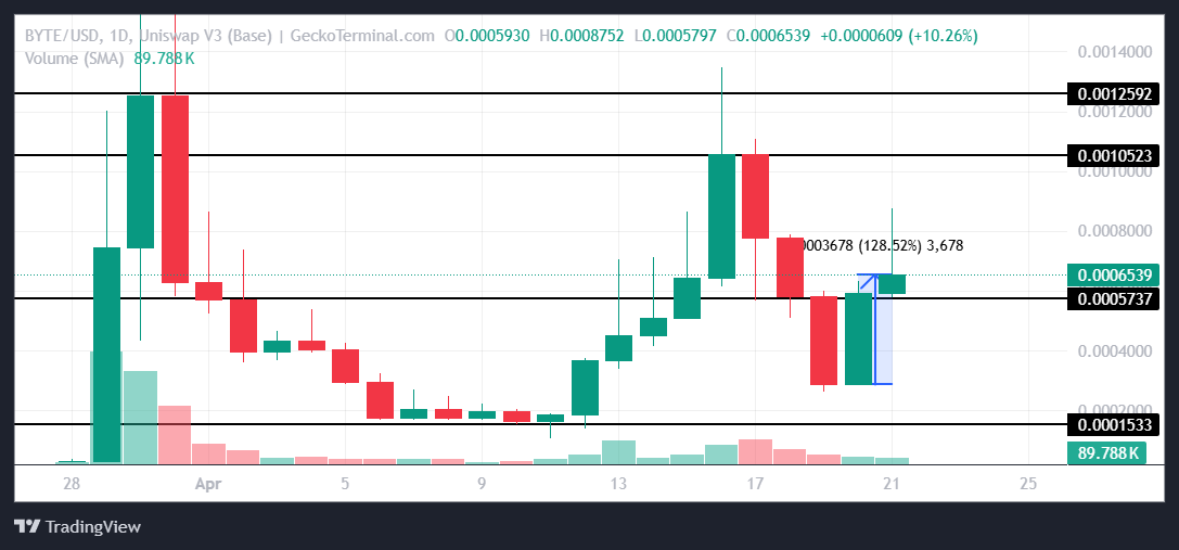 This is expected to reflect in the price action as well in the coming days. BYTE, trading at $0.0006539 is holding above the support of $0.0005737. Securing it as support could push the meme coin upwards towards the resistance of $0.0010523, extending investors’ profits.