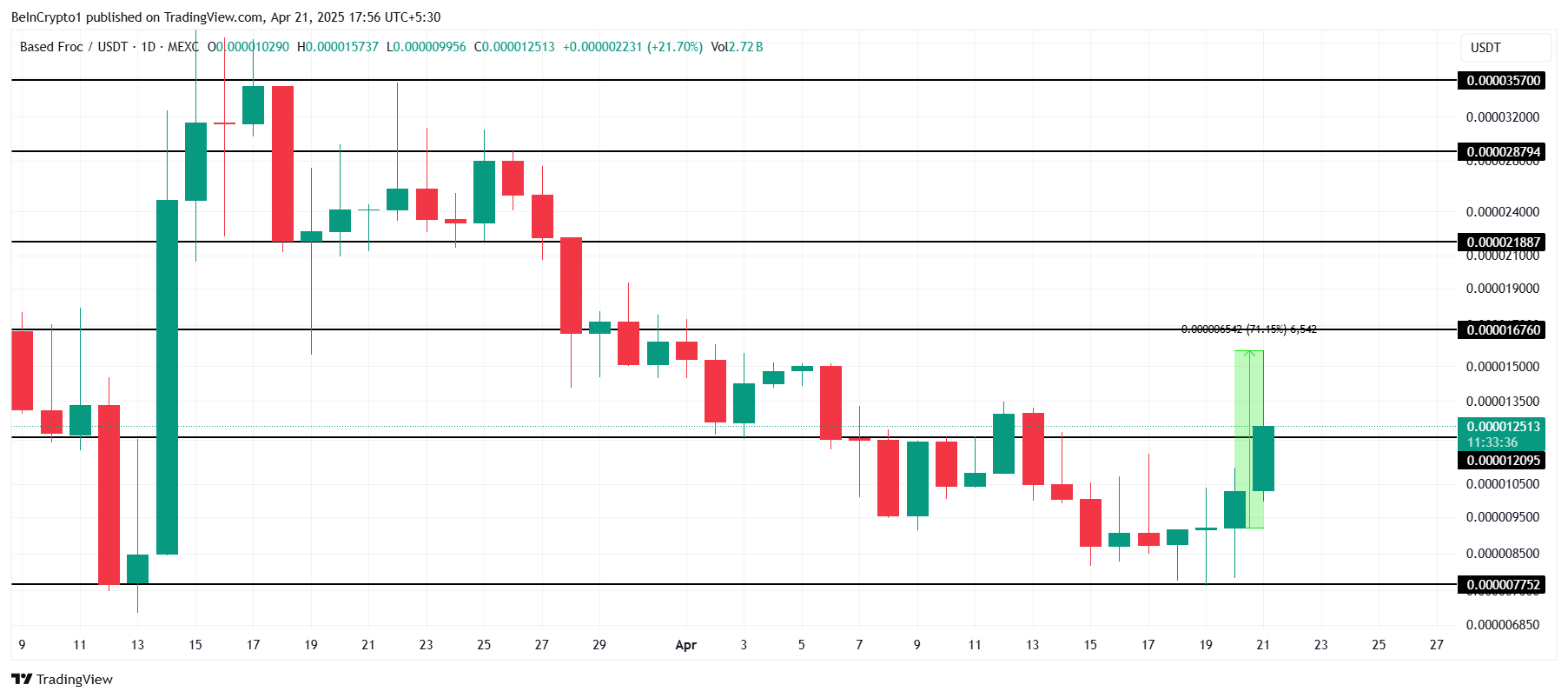 Based Froc (FROC) led the pack in today’s gainers list, jumping nearly 71% during the intra-day high to claim the top spot in CoinGecko’s “frog-themed” category. FROC first gained attention in mid-February when a Coinbase engineer introduced it using Clanker, an AI-powered token-creation bot from Farcaster.
