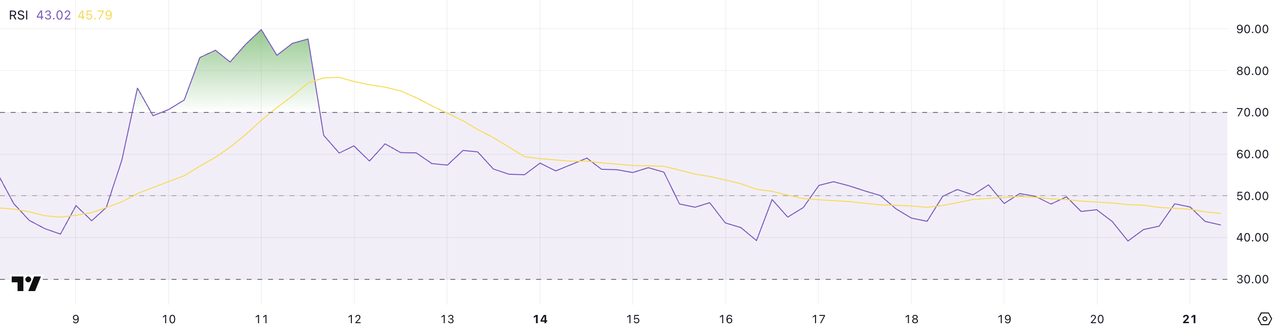 Levels between 30 and 70 are considered neutral, often reflecting consolidation or indecision in the market.
