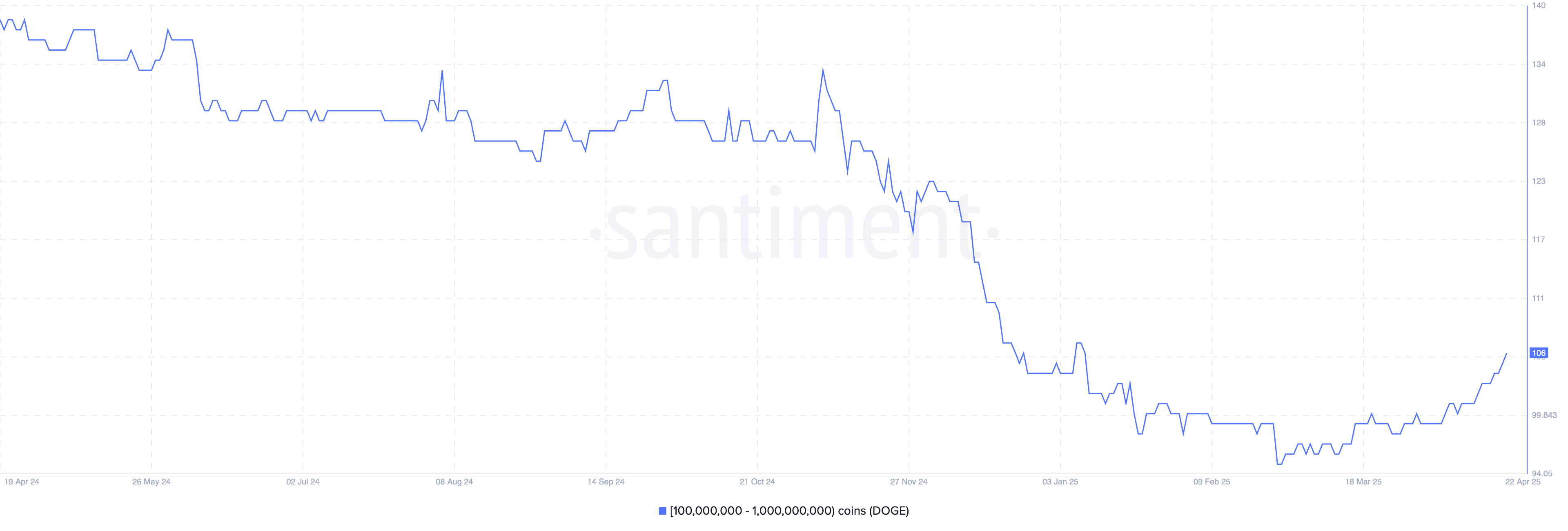 Further, DOGE price may do well as big whales continue to accumulate tokens. The chart below shows that the number of holders with between 100 million and 1 billion tokens has been in an upward trajectory.