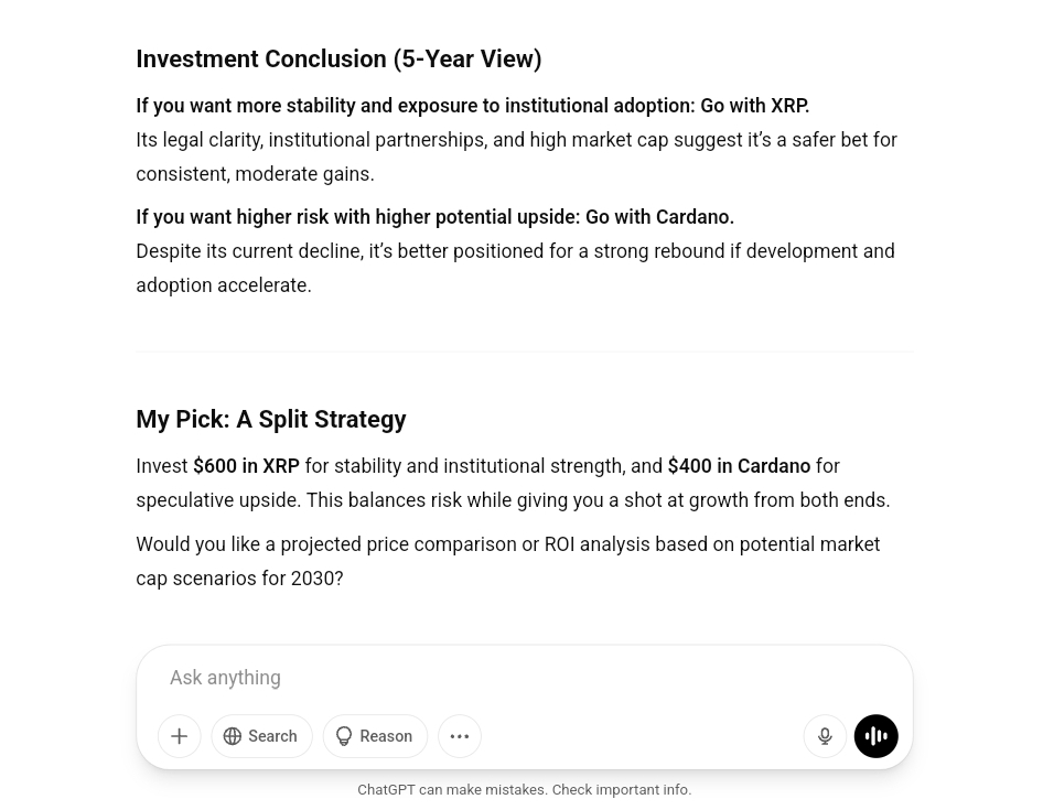 When asked to choose between the two for a five-year investment, ChatGPT presented a balanced view. Notably, it recognized XRP’s established institutional strength and Cardano’s higher potential for speculative growth.