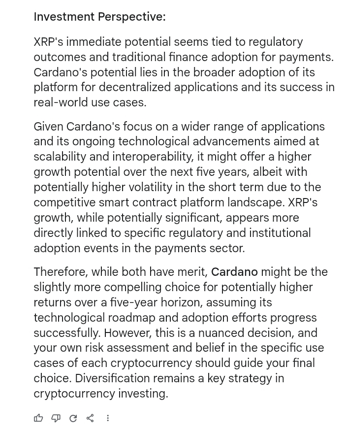 On the other hand, Google Gemini leaned slightly in favor of Cardano. It acknowledged XRP’s strengths in the payments sector but highlighted the ongoing regulatory risks and the asset’s reliance on institutional finance adoption.