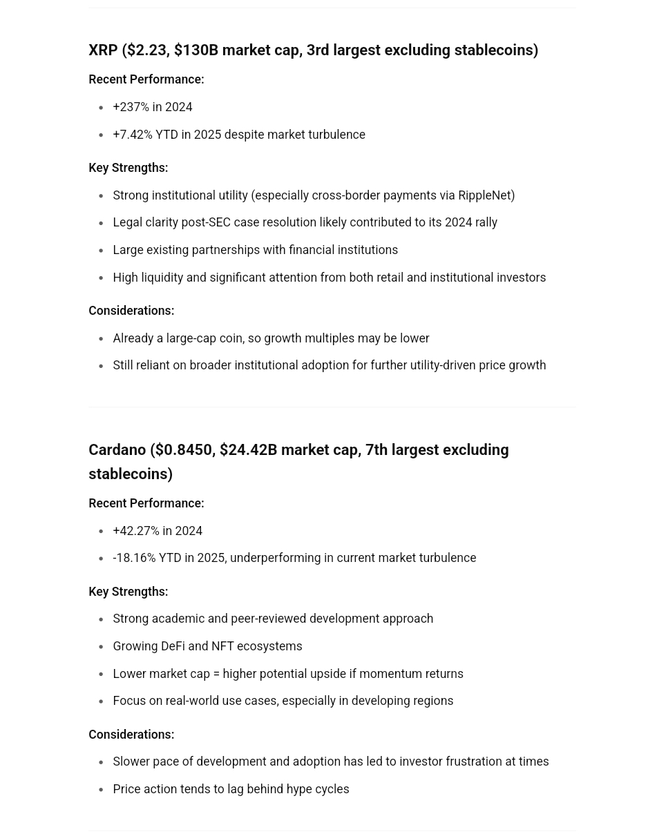Gemini pointed to Cardano’s real-world integrations and efforts to expand in emerging markets as reasons to consider it a strong long-term contender. Though it noted Cardano’s challenges, Gemini suggested that these risks could be offset by the project’s growing technological sophistication and wider application potential.