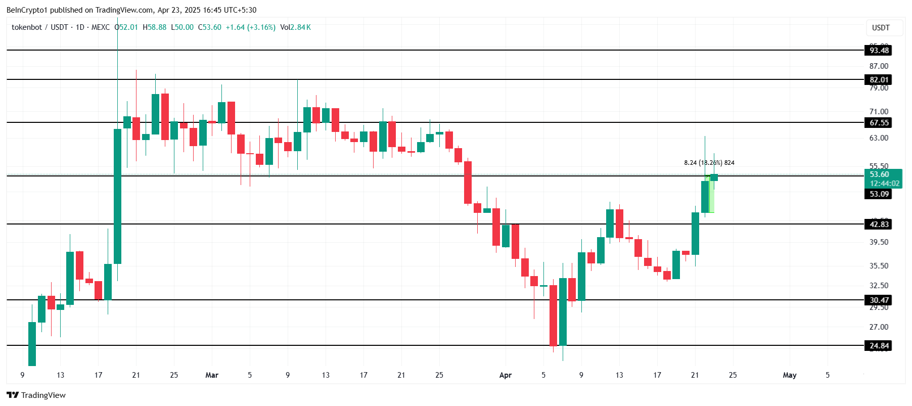 CLANKER has experienced a significant surge of 18% in the last 24 hours, following a 58% increase over the past five days. Currently trading at $53, the altcoin shows strong momentum and is likely to continue its upward trend as market sentiment remains positive.