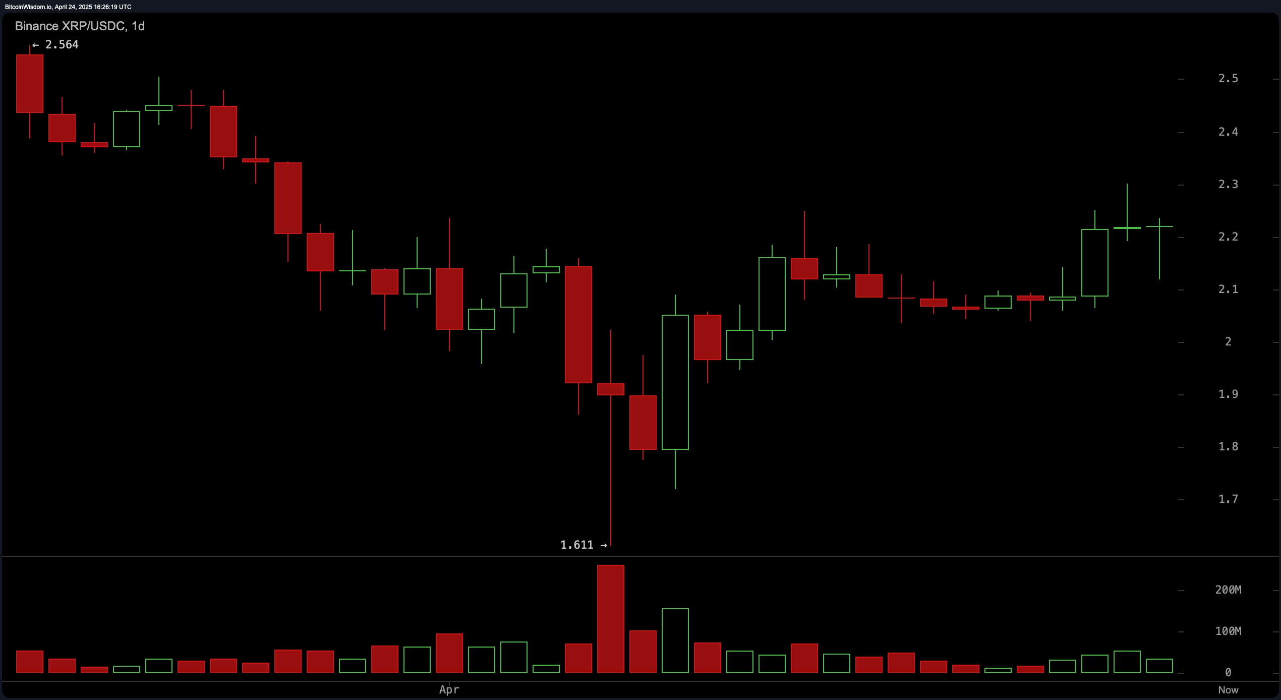 On the 1-hour chart, XRP has broken a prolonged midterm downtrend, posting a notable higher low at $2.118 and rallying to a higher high above $2.22. This reversal is indicative of strengthening bullish momentum, especially with current price action consolidating above $2.20. The Fibonacci retracement levels further confirm this sentiment, with a reversal kicking in at the 61.8% level around $2.188 and a subsequent push to the 0% retracement at $2.302. Traders looking to position within this timeframe might consider a breakout confirmation above $2.24 with tight risk controls near $2.17.
