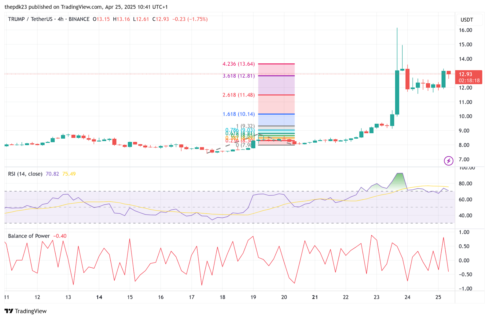 If price fails to hold above $12.81 (3.618 Fib), TRUMP could fall back to $11.48 (2.618 Fib) or even $10.14 (1.618 Fib) to retest support levels. A fall below $10 could result in consolidation near $8.25–$9.33.
