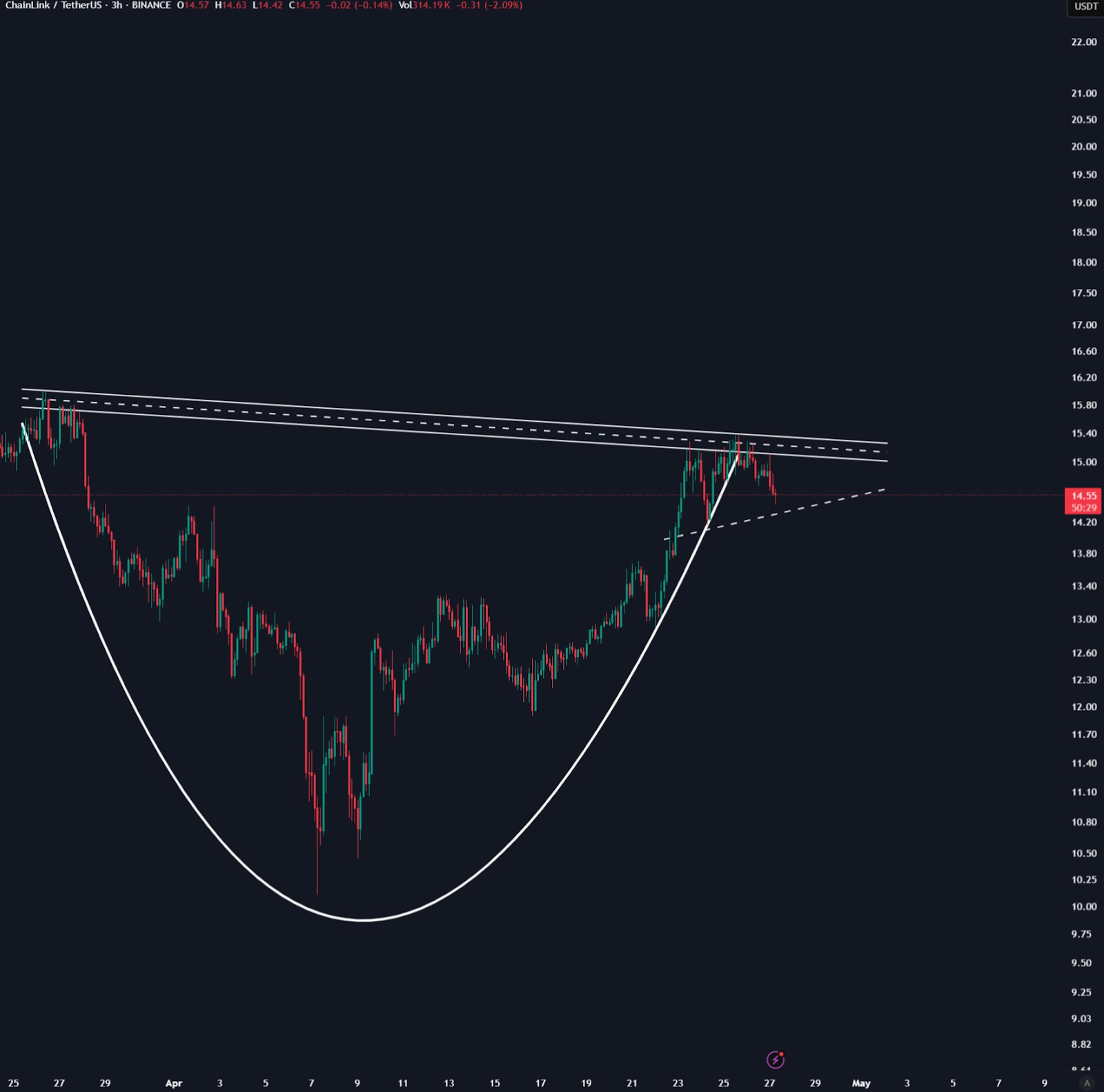 On shorter time spans Chainlink established one of the classic technical formations known as cup and handle. A cup and handle pattern appears mainly in market consolidation periods and projects forward a sustained upward trend.