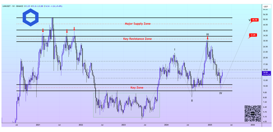 Chainlink completed all four waves, beginning with I, then II, then III, then IV, and the analysis expects it to break out in wave V toward the $40 major supply region while passing through the $28–$32 resistance zone, according to cryptclay. Historical resistance guides the price targets at $31.85 and $45.50, which he has set.