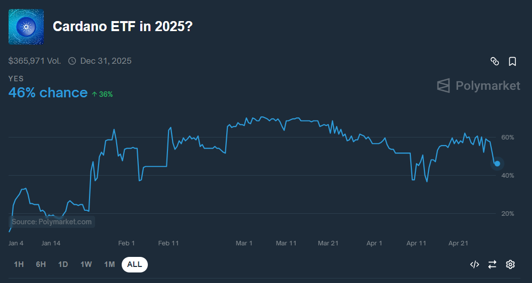 Supporting this trend, data from prediction market Polymarket shows the probability of an ADA ETF approval in 2025 has climbed to 46%, suggesting mounting anticipation in the community.