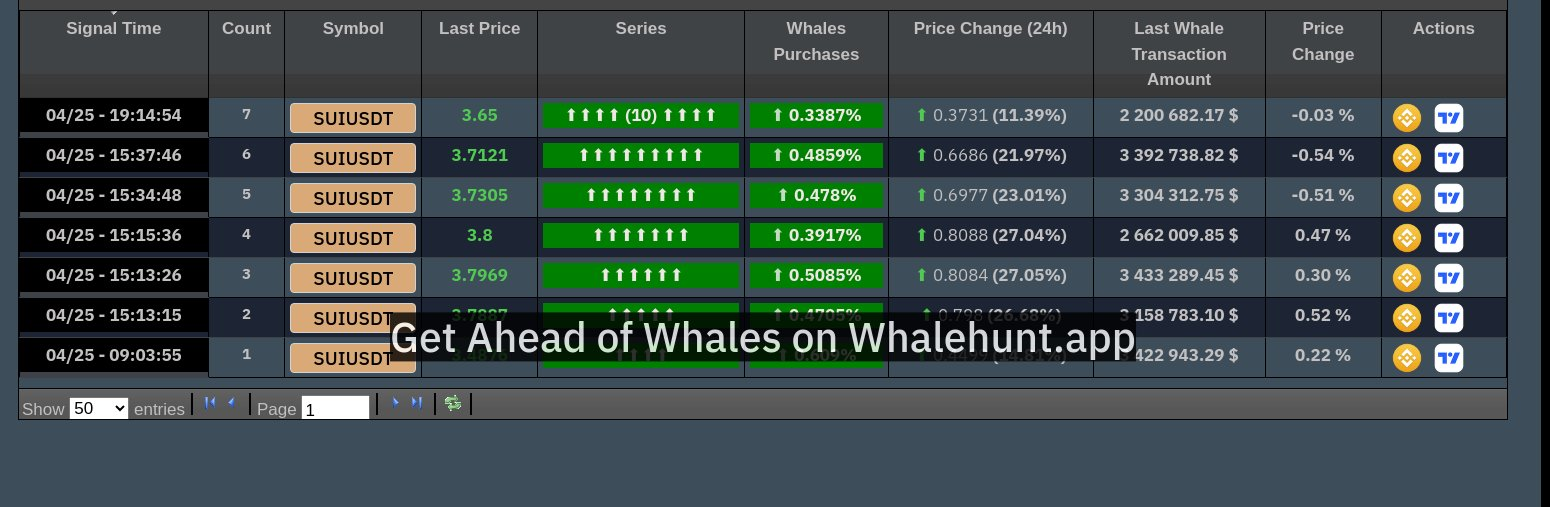 Large traders, often called whales, have shown consistent interest in SUI. On April 25th, whale purchases peaked at $3.65 with steady accumulation from $3.71 to $3.8. Whale purchase percentages ranged from 0.3387% to 0.5085%, signaling increasing involvement.