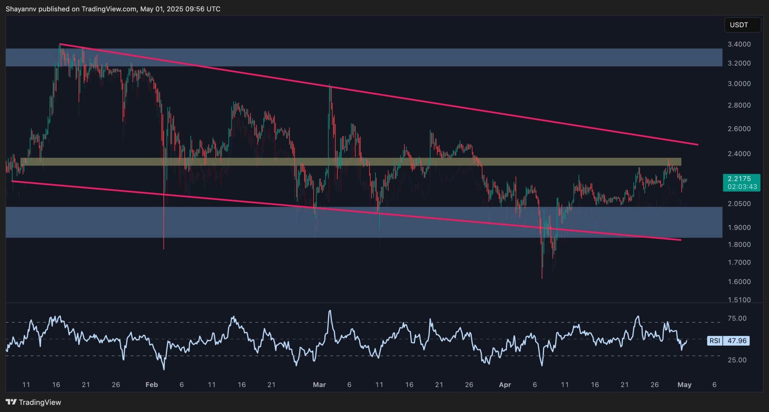 This confluence of factors points toward a high probability of a retracement toward the $2 psychological level in the near term. Should demand fail to re-enter around this zone, deeper corrections could follow. However, if buyers step in with conviction, this region may serve as a launchpad for another breakout attempt toward $2.6 and beyond.