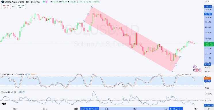 The Solana price has been in bulls hands over the past few weeks, holding over key long term resistance, turning them into supports levels. The cryptocurrency broke out from a descending price channel in April, and is now consolidating around a tight range. This consolidation suggests support at major levels, indicating a signal for a bigger move.