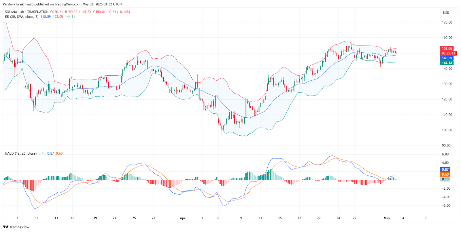 Bollinger Bands on the 4-hour timeframe are in a squeeze phase, signaling that volatility is compressing and a breakout may be imminent. Price is hovering near the upper band at $153.05, further supporting the case for upward pressure.