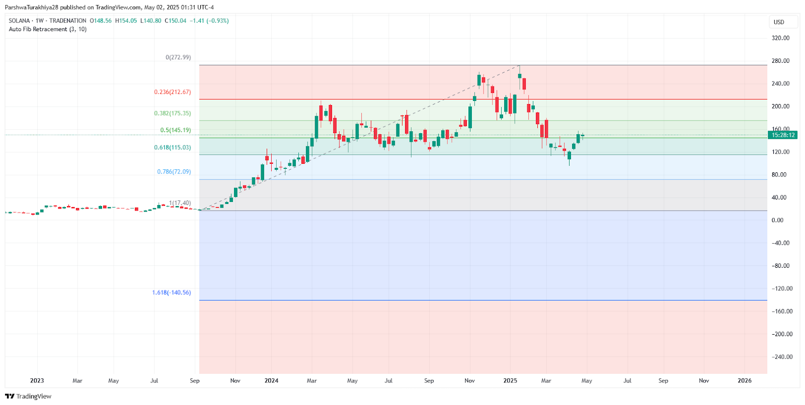 Solana’s weekly price action reveals a climb back toward the 0.5 Fibonacci retracement level at $145.19, measured from the cycle low of $17.40 to the all-time high of $272.99. This region between $145 and $150 has historically functioned as a congestion zone, often serving as a launchpad or stalling point.