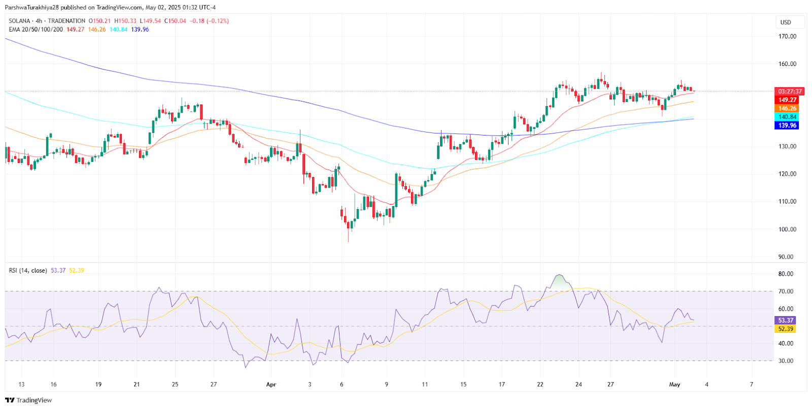 All major EMAs (20, 50, 100, 200) are currently positioned beneath the price on the 4-hour chart, with the 20 EMA at $149.27 and the 50 EMA at $146.26 converging just below market price, creating dynamic support. The 200 EMA at $139.96 marks the last major support before breakdown territory.